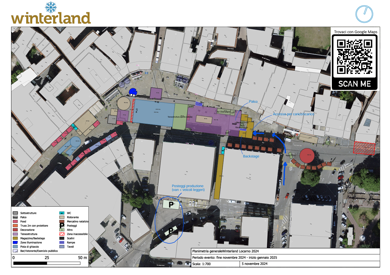 – È consentito avvicinare i veicoli al palco per le operazioni di carico e scarico dietro al palco (vedi frecce blu nella mappa))